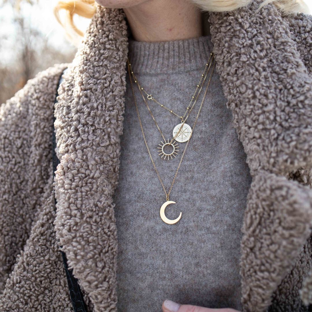 Przy wyborze łańcuszka do zawieszki kierujemy się zasadą proporcji i estetyki. Dla drobnych, subtelnych zawieszek, takich jak np. naszyjnik z muszelką czy naszyjnik z serduszkiem, rekomendujemy klasyczny ankier o długości 42–45 cm. Taka konfiguracja pozwala pięknie wyeksponować zawieszkę i zachować harmonijny wygląd całej kompozycji. Oczywiście pozostawiamy pełną swobodę w doborze łańcuszka – każdy ma swój styl i preferencje noszenia biżuterii. Niemniej, są modele, które szczególnie polecamy w określonych zestawieniach. Przykładem może być nasze bestsellerowe słońce no.1, które najlepiej prezentuje się na klasycznym ankierze o długości 50 cm. Z kolei słońce no. 2 doskonale komponuje się z łańcuszkiem z kuleczkami o długości 45 cm, tworząc idealny duet z słońcem No.1.