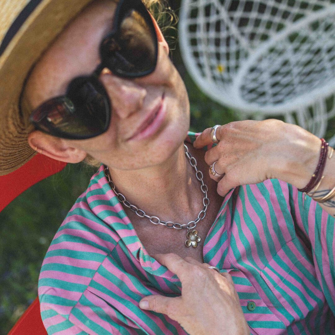 Bestsellerem w tej kategorii jest duży pozłacany kwiat na grubym srebrnym łańcuchu. To jeden z pierwszych modeli, w którym odważyłam się połączyć srebro ze złotem. Następstwem było stworzenie geometrycznej i charakterystycznej kolekcji bicolor. A sam kwiat? Oszalałyście na jego punkcie. Jest odważny w formie, ale robi niesamowite wrażenie na szyi. To naprawdę miłość od pierwszego wejrzenia. Noszę go kolejny rok i nadal mnie zachwyca.